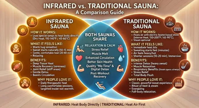 After a long, stressful day, saunas are the perfect way to speed up recovery and melt away tension. But not all saunas are the same, and finding the one that truly fits your needs can be tricky. That’s why people turn to a closer, in-depth look at Infrared Sauna vs Traditional Sauna. Here’s what you need to know: